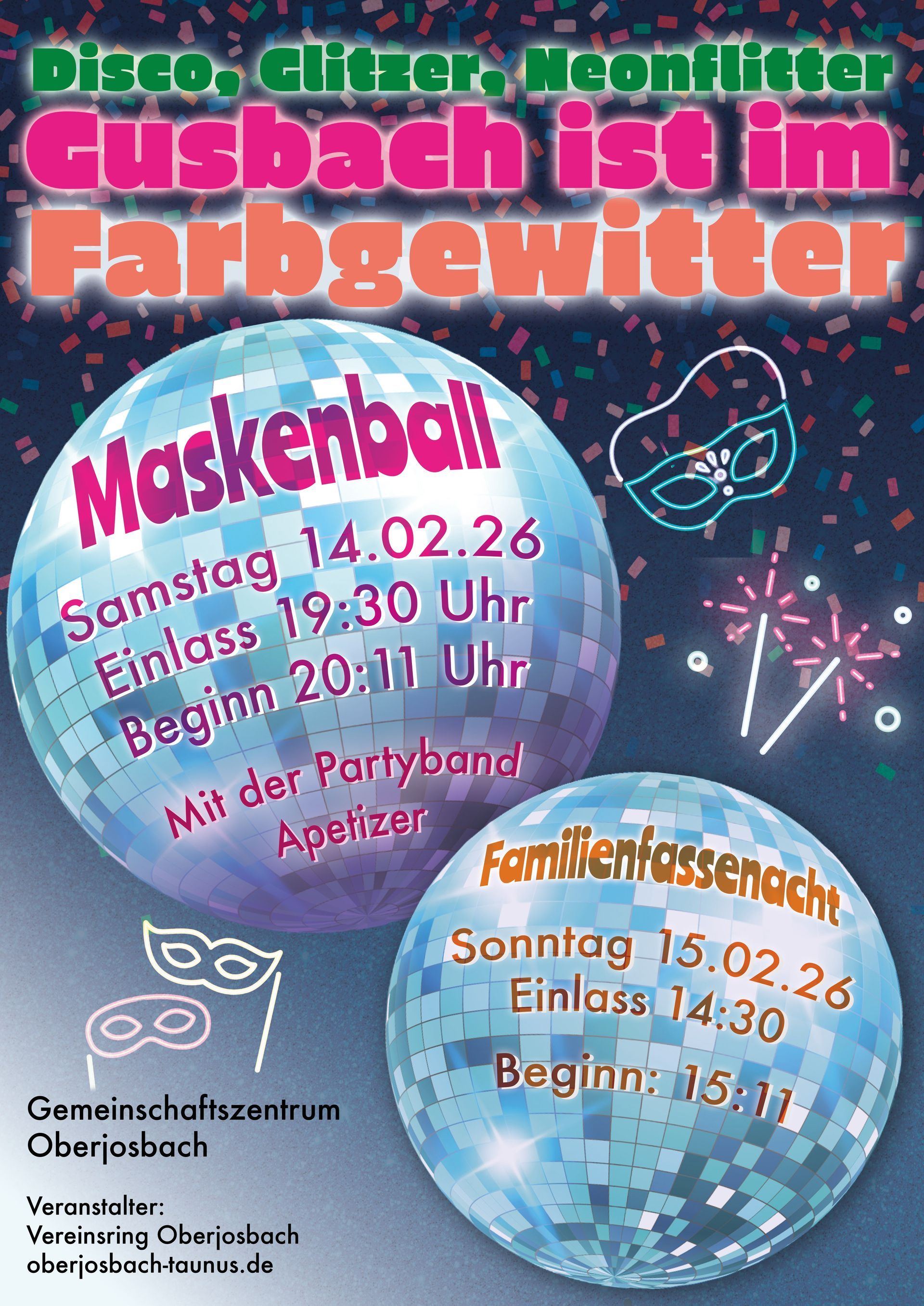 Unter dem Motto „Disco, Glitzer, Neonflitter – Gusbach ist im Farbgewitter “ lädt der Vereinsring Oberjosbach für Samstag, 14. Februar, alle Faschingsfreunde herzlich zu einem bunten Maskenball ein. Der Einlass beginnt um 19:30 Uhr, das Programm startet um 20:11 Uhr. Karten sind direkt an der Abendkasse erhältlich. Besonders für Gäste mit Vollmasken lohnt sich das Kommen: sie erhalten beim Einlass einen Gutschein für ein Freigetränk.
