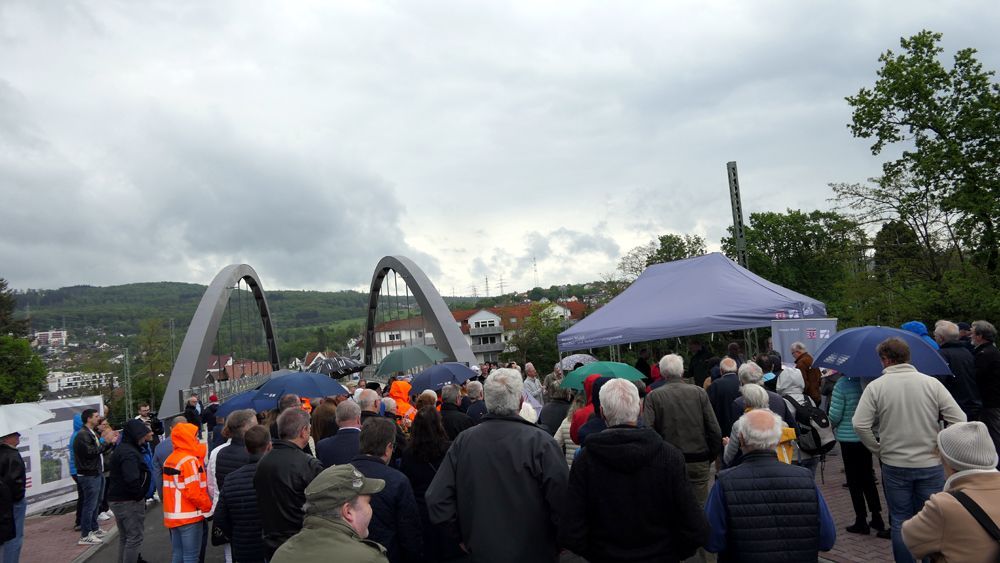 Für die auftraggebenden Behörden und Firmen war sie ganz trocken der „Ersatzneubau L3027“, im allgemeinen Sprachgebrauch „die neue Brücke/ die neu Brick“, und nicht zuletzt für viele Niedernhausenerinnen und Niedernhausener wegen Umleitung und Baulärm ein riesiges Ärgernis. Als „Hahnwaldbrücke“ wird das neue Bauwerk künftig auf der Straßenkarte stehen, am 07. Mai 2024 wurde die Brücke über die Bahngleise an der Wiesbadener Straße eröffnet und für den Verkehr freigegeben. Um den Anlass würdig zu begehen, hatte Bauherr HessenMobil zu einer kleinen Feier geladen. Vertreter von Politik und beteiligten Baufirmen waren zugegen, auch etliche Anwohner der Wiesbadener Straße und Nebenstraßen freuten sich, die Brücke persönlich einweihen zu können.