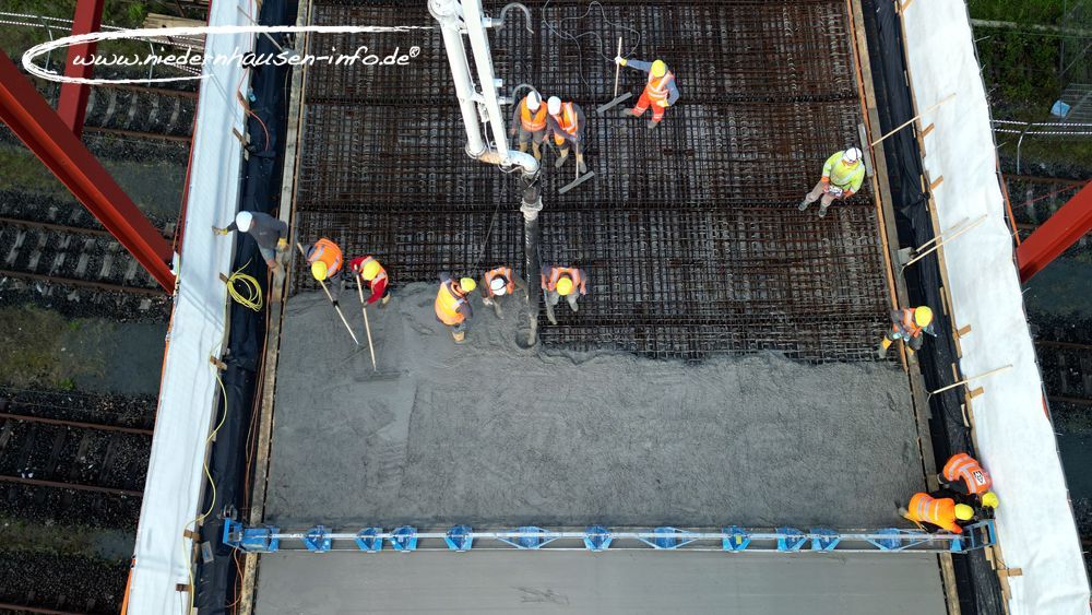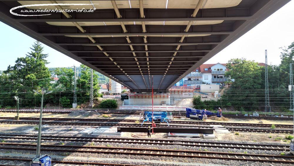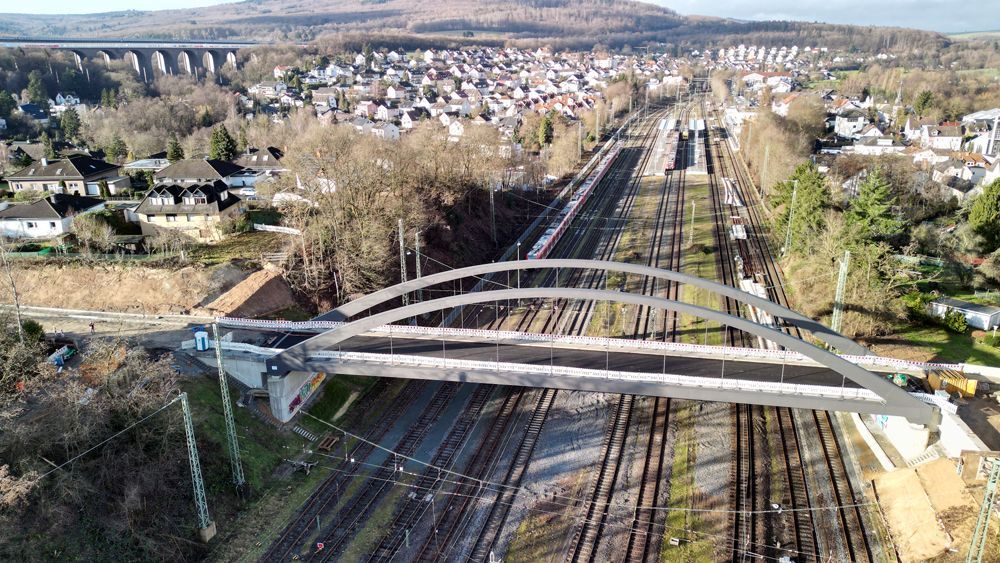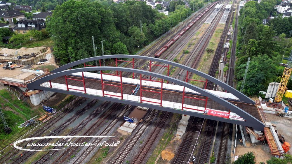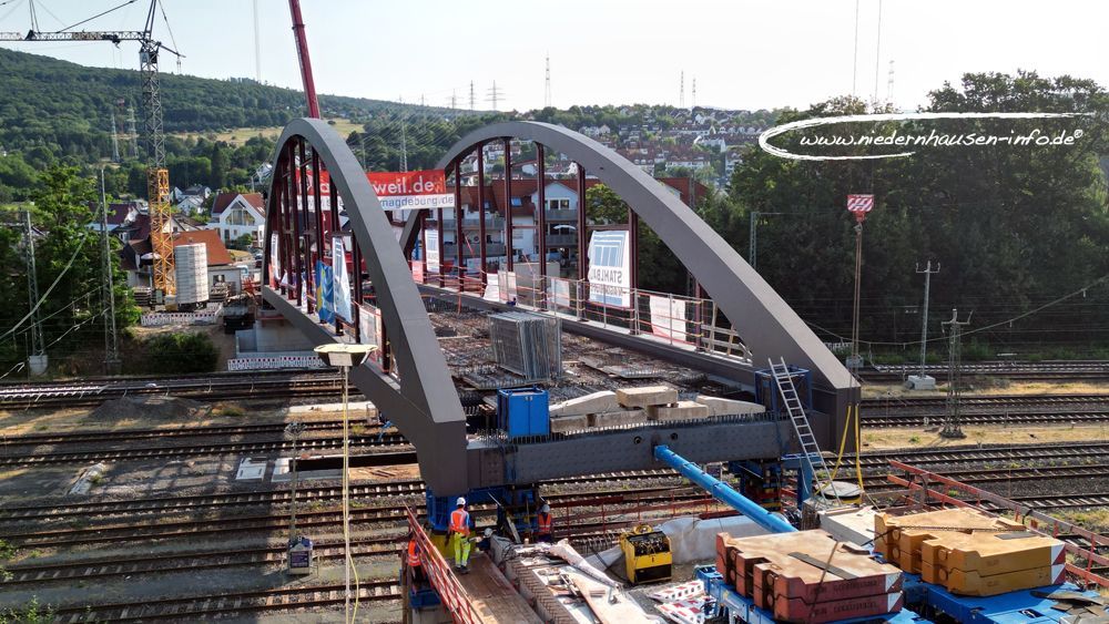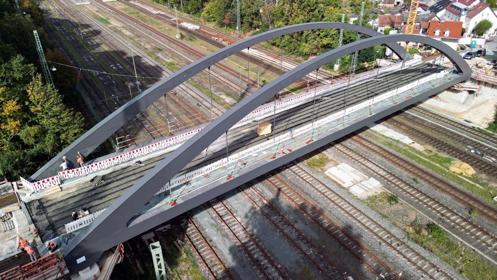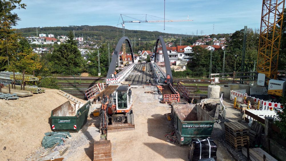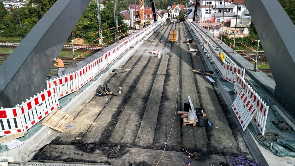 Auf der Schiene wird es voraussichtlich im Oktober auch noch einmal kurze Beeinträchtigungen durch Sperrpausen im Bahnverkehr geben. Dann wird das Verschubgerüst unter der Brücke zurückgebaut und durch die Bahn neue Oberleitungen installiert.