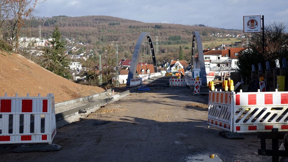 Die letzten Bauteile der Brückenkonstruktion sind montiert und die markanten roten Stützstreben unter der Bogenkonstruktion mittlerweile entfernt. In den nächsten Tagen beginnt der Bau der eigentlichen Straßenkonstruktion auf der Brücke. Zusätzlich zu den Betonarbeiten wird die Entwässerung der Brücke eingebaut und an beiden Enden zur Wiesbadener Straße hin an das Abwassernetz angeschlossen. Im Anschluss wird die Straßenoberfläche auf der Brücke angelegt und an das Straßenniveau der Wiesbadener Straße angeglichen. Hessen Mobil nutzt diese Gelegenheit, um die Straßenoberfläche im Bereich der Zufahrt Wiesbadener Straße zur Goethestraße grundständig zu erneuern. Aus Sicherheitsgründen muss die Zufahrt während der gesamten Dauer dieser Maßnahme gesperrt bleiben. Um den Zugang zur Goethestraße für die Anwohner sicherzustellen, ist hier eine Umleitung über die Straßen „Am Hahnwald“ und „Schlesierweg“ eingerichtet.