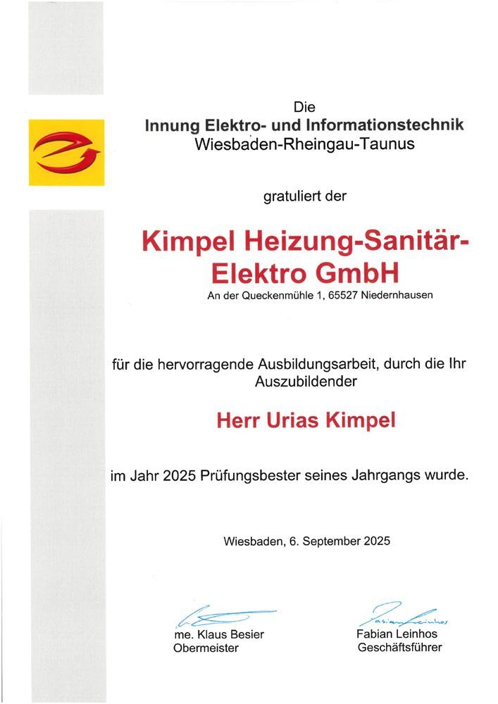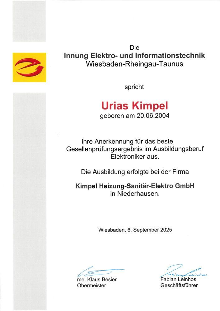 Bei der feierlichen Freisprechung der Gesellen am Samstag, den 6. September, gab es für die Firma Kimpel Heizung-Sanitär-Elektro GmbH besonderen Grund zur Freude: Der Auszubildende Urias Kimpel wurde als Prüfungsbester im Elektroniker-Handwerk ausgezeichnet.