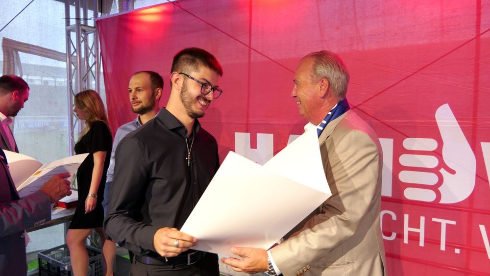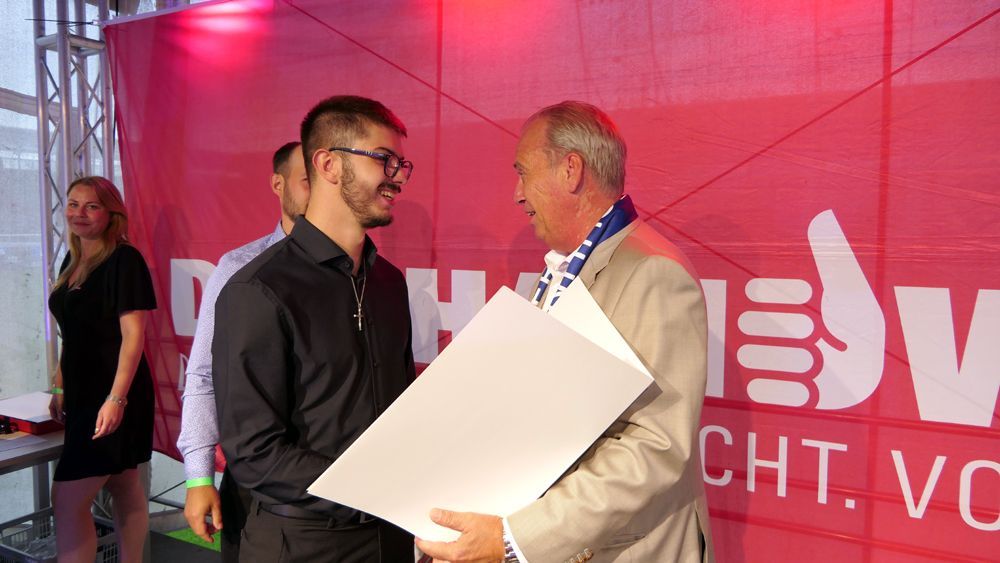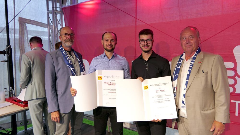 Auf dem Erinnerungsfoto ist Urias gemeinsam mit seinem Ausbildungsmeister Jan Hantusch (rechts) zu sehen. Auch er kennt den Weg des Erfolges nur zu gut: Hantusch absolvierte seine Ausbildung ebenfalls bei Kimpel – und wurde 2018 ebenfalls als Bester seines Jahrgangs ausgezeichnet.